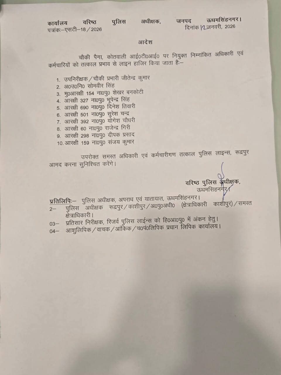 इसके साथ ही कोतवाली आईटीआई अंतर्गत चौकी पैगा पर तैनात प्रभारी सहित कुल 10 पुलिसकर्मियों को तत्काल प्रभाव से लाइन हाजिर कर दिया गया है। जिन अधिकारियों और कर्मचारियों को लाइन हाजिर किया गया है, उनमें—