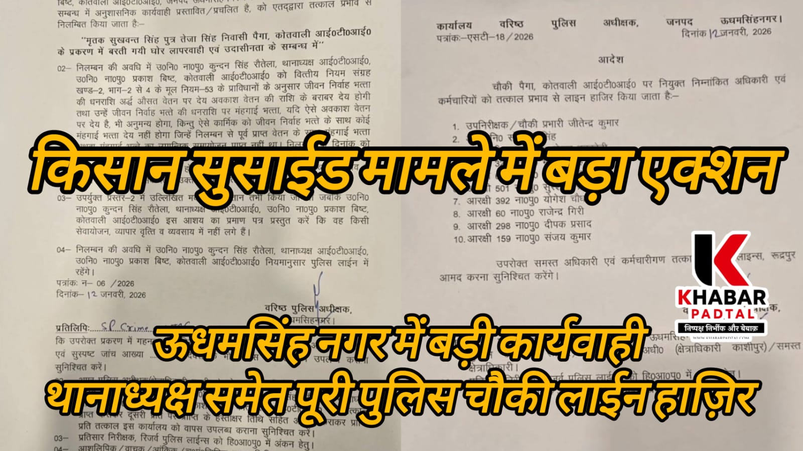 रुद्रपुर (उधम सिंह नगर)। जनपद उधम सिंह नगर में पुलिस की कार्यप्रणाली को लेकर एक बार फिर सवाल खड़े हो गए हैं। कोतवाली आईटीआई क्षेत्र से जुड़े मृतक सुखवंत सिंह पुत्र तेजा सिंह, निवासी ग्राम पैगा के प्रकरण में गंभीर लापरवाही और उदासीनता सामने आने के बाद वरिष्ठ पुलिस अधीक्षक (SSP) मणिकांत मिश्रा ने कड़ा रुख अपनाते हुए बड़ी अनुशासनात्मक कार्रवाई की है। इस कार्रवाई से पूरे पुलिस महकमे में हड़कंप मच गया है।